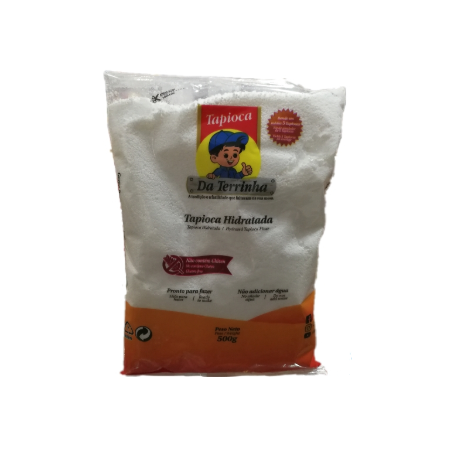 Tapioca Hidratada de la marca Da Terrinha en formato bolsa de 500g, listo para preparar, no añadir agua, rinde alrededor de 5 tapiocas. No contiene gluten.