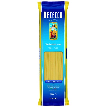 Pasta Fedelini Nº10 De Cecco 500G La origen de la Pasta Fedelini de De Cecco remonta a los territorios en Liguria de la provincia de Genova, de la Ciociaria y de Nápoles. Es una pasta larga con sección redonda con un espesor ente 1,37 y 1,47 mm.