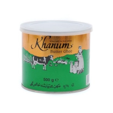 La mantequilla clarificada pura Khanum, también conocida como "ghee", es una grasa láctea anhidra procesada de la mantequilla para separar los sólidos lácteos y el agua de la grasa butírica. Ingrediente muy usado en la cocina asiática, árabe o hindú, entre muchas otras.
