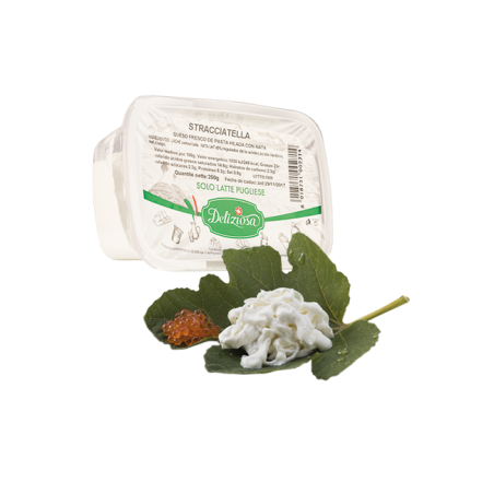 La stracciatella Deliziosa , un requesón estirado, elaborado únicamente con leche fresca, tiras finas de mozzarella cuidadosamente controladas mezcladas con nata, dan lugar a un manjar y un manjar que solo lo delicioso puede darte