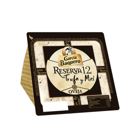 Cuña de Queso Reserva 12 Oveja, Trufa y Miel, el primer queso de Oveja que une la trufa y la miel, resultando un sabor exclusivo y exquisito. Nuestra tradicional receta de oveja con los mejores compañeros de viaje. Un queso muy especial sorprendente por su agradable y dulce toque de miel y su irresistible aroma y sabor a trufa