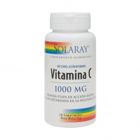 Solaray Vitamina C 1000mg 30 comprimidos retard. Proporciona una actividad antioxidante y se destina a proporcionar apoyo nutritivo para la síntesis normal de colágeno, el cartílago y el desarrollo óseo, la función inmune, integridad de los vasos capilares y la sangre y la transmisión del impulso nervioso.