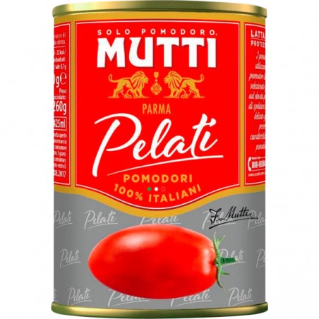 Tomates Mutti (Pomodori Pelati): tomates italianos de alta calidad y perfectamente maduros que se han blanqueado simplemente. Son carnosos y cubiertos de una cremosa salsa de tomate. Perfecto para las salsas italianas clásicas, como la amatriciana o la salsa boloñesa, donde el tomate debe ser visible y bien definido.