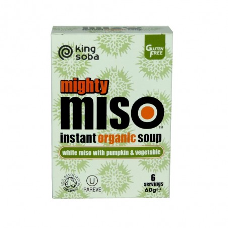 ¿Qué es el miso? El miso es un alimento vivo fermentado hecho de soja. Algunos miso también contiene arroz o cebada. Los orígenes del miso se remontan a la antigua China durante más de 2000 años. Fue traído a Japón en el siglo séptimo por artesanos en un superalimento rico. Se considera que el miso tiene muchos beneficios para la salud cuando se consume regularmente y es una gran fuente de proteínas y minerales fácilmente digeribles. La Sopa de Miso Orgánica Mighty de King Soba con calabaza es deliciosa, conveniente y nutritiva.