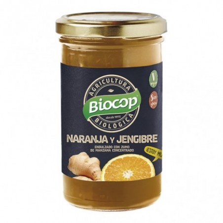 Compota de naranja con jengibre. Elaborada con naranjas maduras mediante cocción mínima para garantizar todo el sabor y aroma de la fruta. Endulzado con concentrado de zumo de manzana.