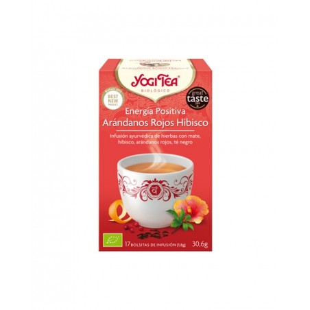 Esta brillante mezcla de aromas ayuda a levantar el ánimo y a darnos energía. Para seguir sonriendo, incluso en situaciones de estrés, siéntate y disfruta de una taza de YOGI TEA Energía Positiva Arándanos Rojos Hibisco. El mate verde, la guaraná y el té negro Assam te vigorizarán y ayudarán a seguir. El vibrante hibisco, el afrutado arándano rojo, la rosa mosqueta y la hierba limón