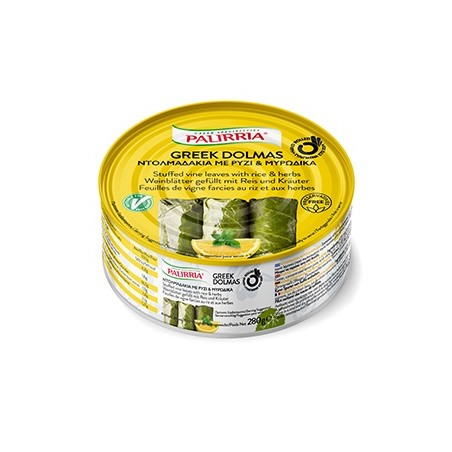 Arroz (cocido) 60%, agua, hojas de parra 10%, aceite de soja, cebollas, jugo de limón del concentrado de jugo de limón, eneldo 2,7%, menta 1,4%, pimienta negra, ácido: ácido cítrico. Puede contener trazas de sulfitos